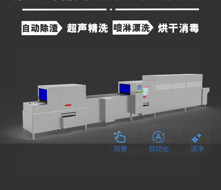 上超商用全自動超聲波洗碗機用于中、大型食堂清洗各類餐具等,由噴淋除渣預(yù)洗段、超聲清洗段、噴淋漂洗段(含清水噴淋漂洗)、烘干消毒段四段及餐具定位傳送網(wǎng)帶、控制系統(tǒng)、安全防護系統(tǒng)等部分及主體框架構(gòu)成。核心技術(shù)為超聲乳化油脂,僅需少量普通洗潔精或食用堿,無需專用洗滌劑,即可達到良好的清洗效果。